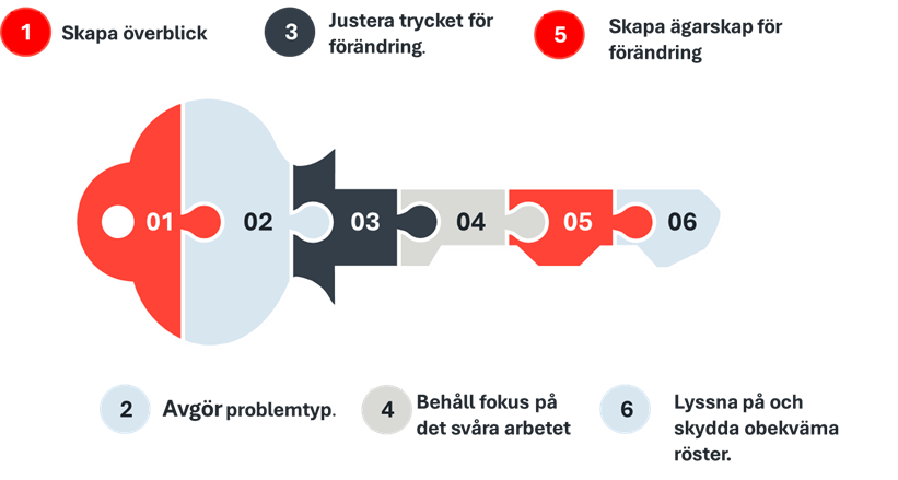 Givet den komplexa och adaptiva utmaning som regional utveckling är presenterade vi 6 nycklar för hur man i regionen kan anta ett tydligare regionalt ledarskap. Det handlar bl.a. om hur man gör för att justera ”trycket” i processen för att åstadkomma verklig utveckling (förändring) och om hur du behåller fokus på det svåra arbetet.